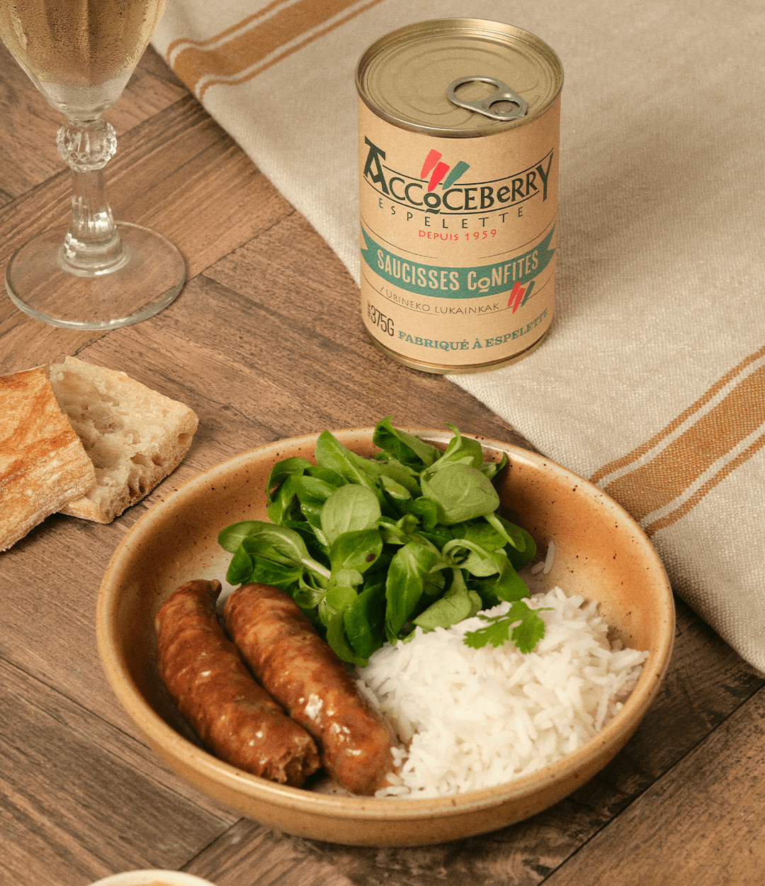 Préparée à partir de viande de porc sélectionnée, assaisonnée d’ail, sel, poivre et piment d’Espelette AOP, elle est lentement cuite pour un moelleux incomparable.