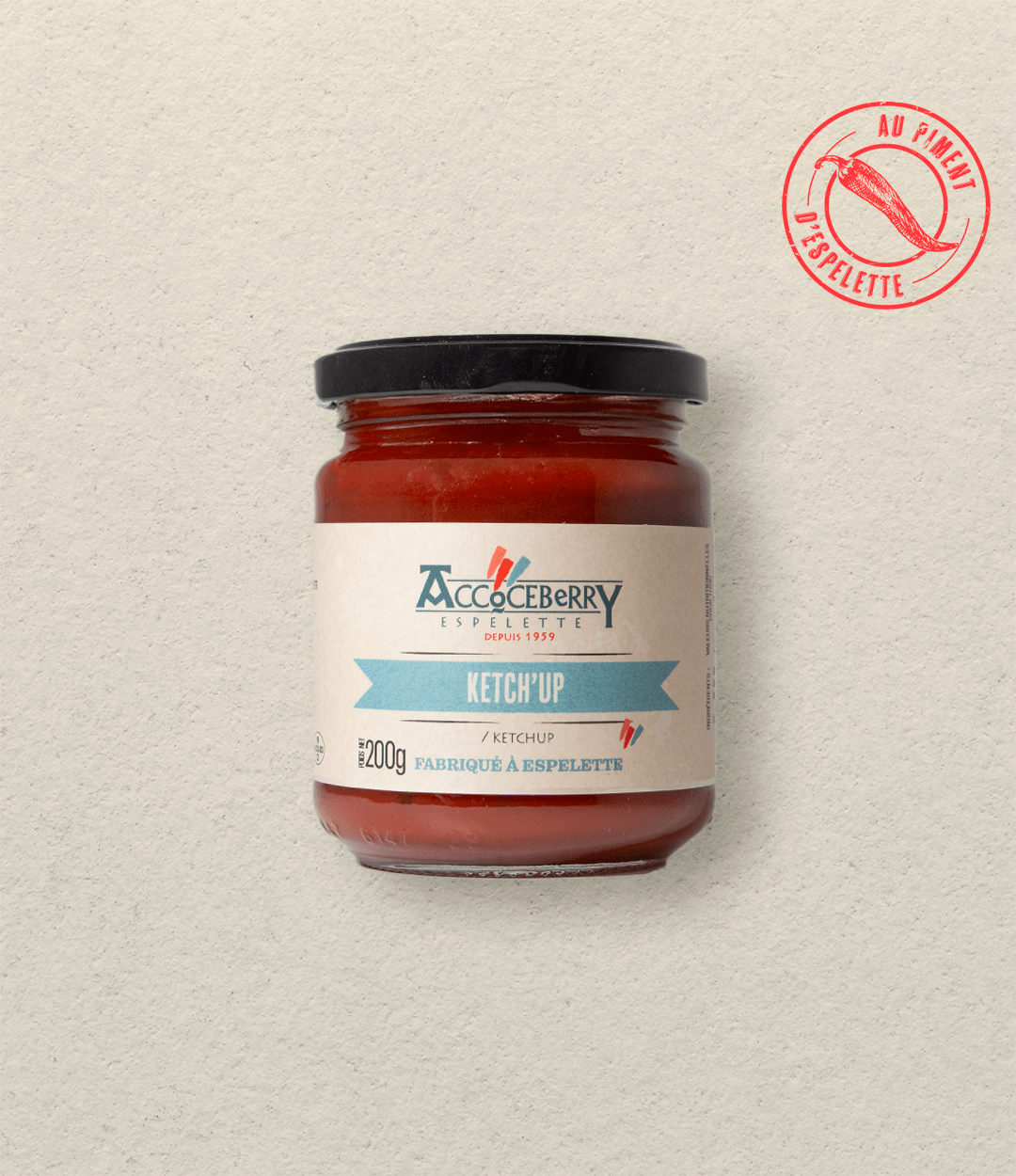 Ingrédients : Concentré de tomate (48%), sucre, vinaigre d’alcool blanc, coulis de piment d’Espelette, épices.