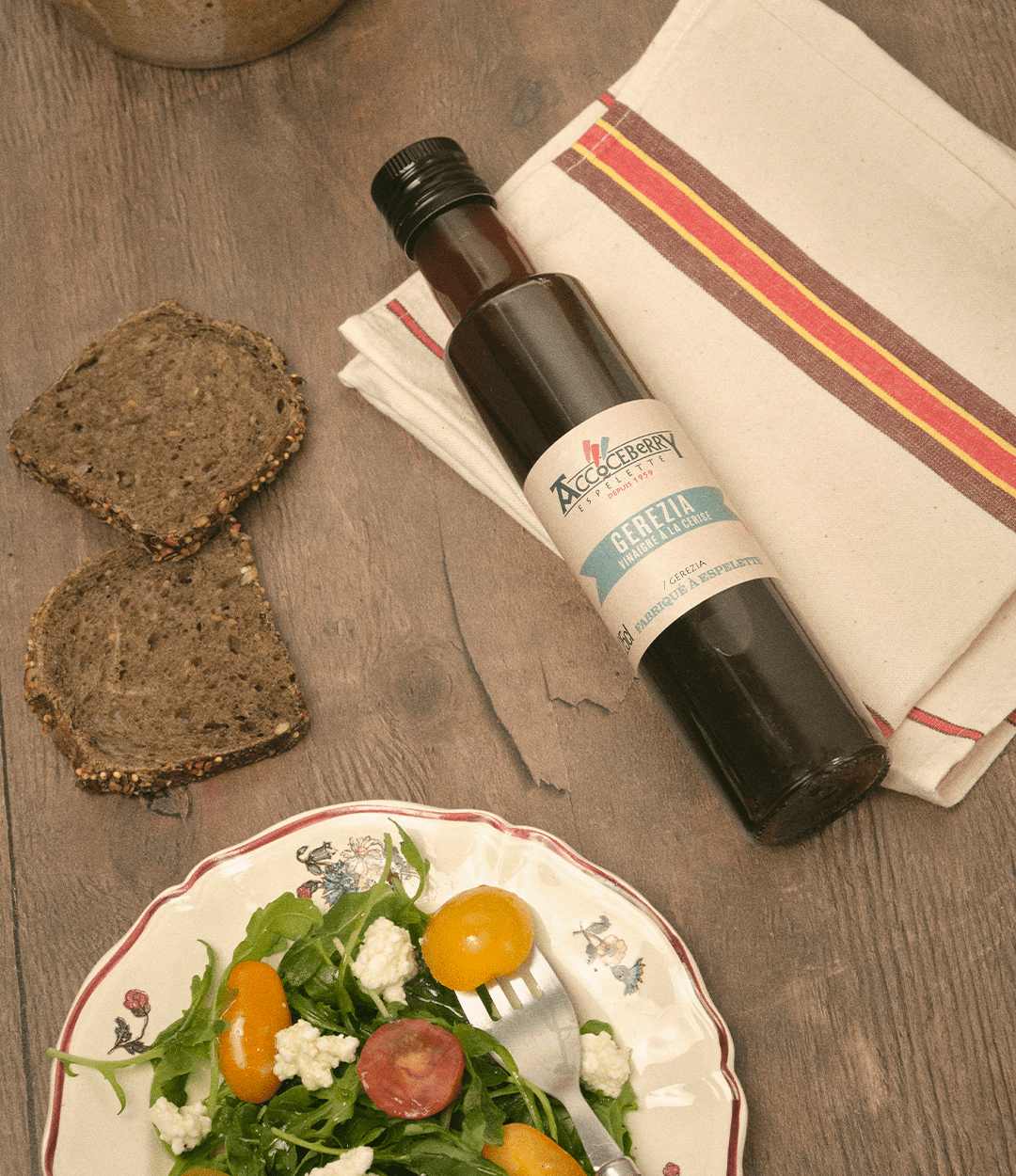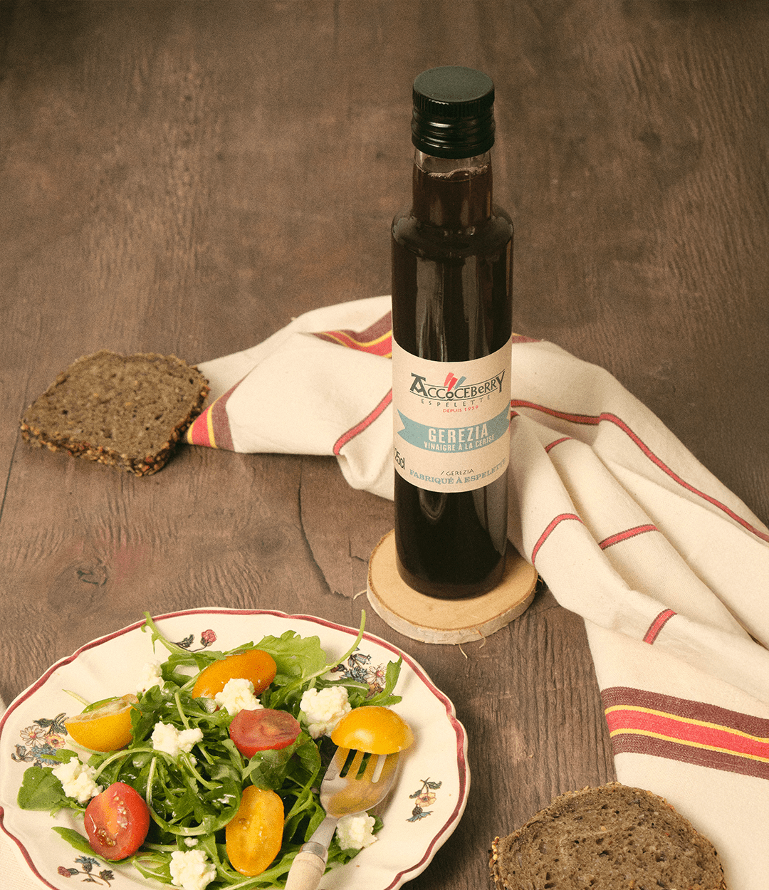 Utilisez le vinaigre Gerezia comme un assaisonnement raffiné pour vos salades de caractère : un filet sur une mâche, une roquette ou une salade de gésiers suffit à révéler toute sa douceur fruitée. Pour vos plats chauds, versez-le en fin de cuisson pour déglacer un foie de veau, un magret ou une viande confite : le vinaigre s'évapore légèrement, laissant place à une sauce brillante, équilibrée et subtilement acidulée.