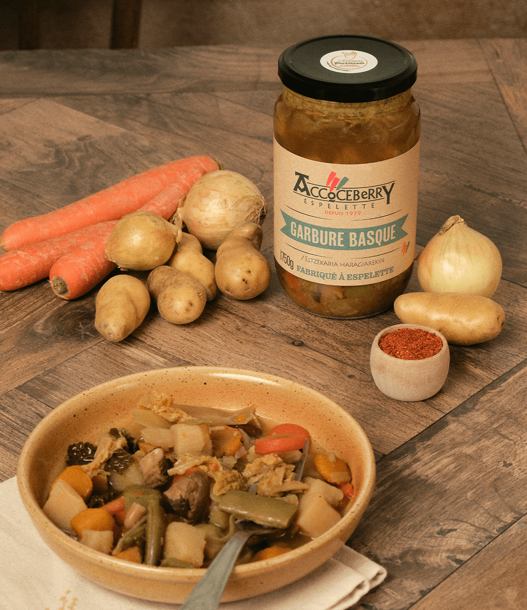 Chez nous, elle est préparée dans le respect des traditions : une cuisson lente, à base de légumes de saison – poireaux, carottes, choux, navets – et de bons produits bruts, arrivés directement à l’atelier. Elle débute toujours avec un peu de graisse de canard, des xamangos rissolés, des oignons caramélisés… Puis les légumes, l’eau, les manchons de canard, et bien sûr, une touche de piment d’Espelette.